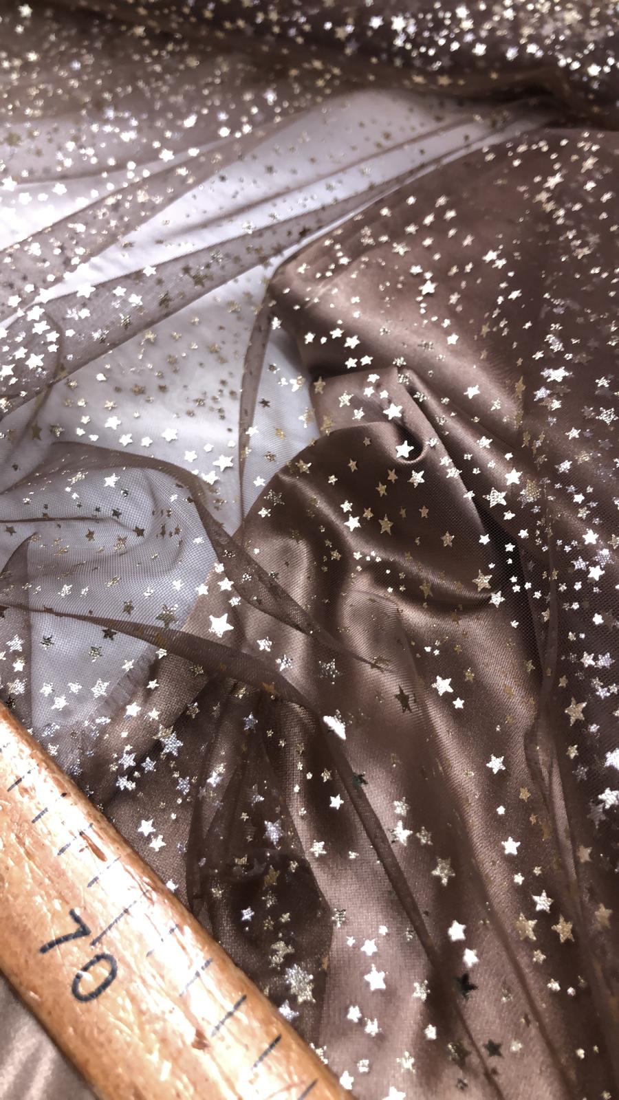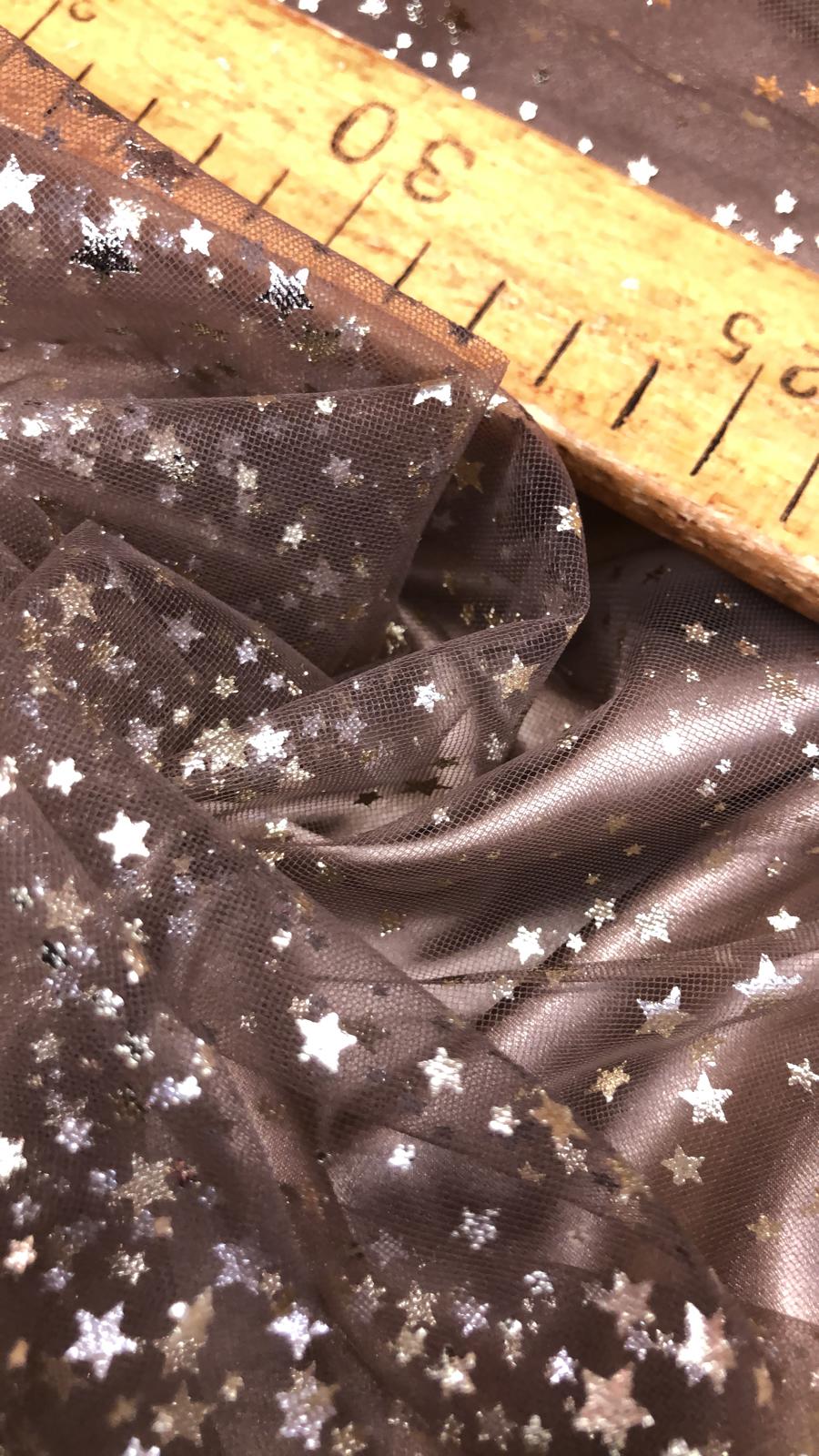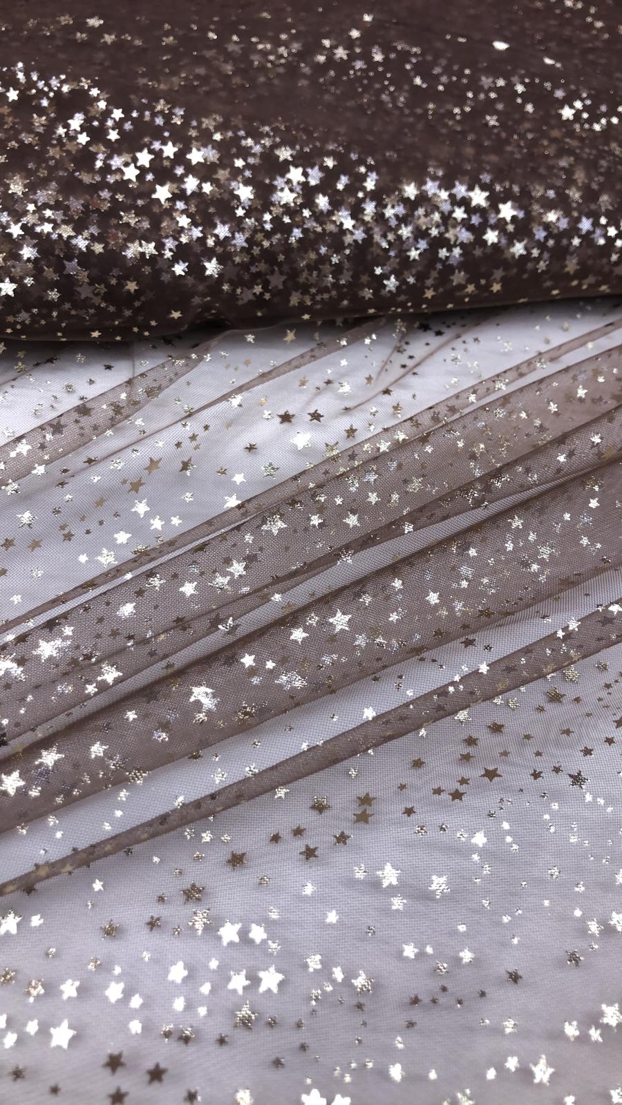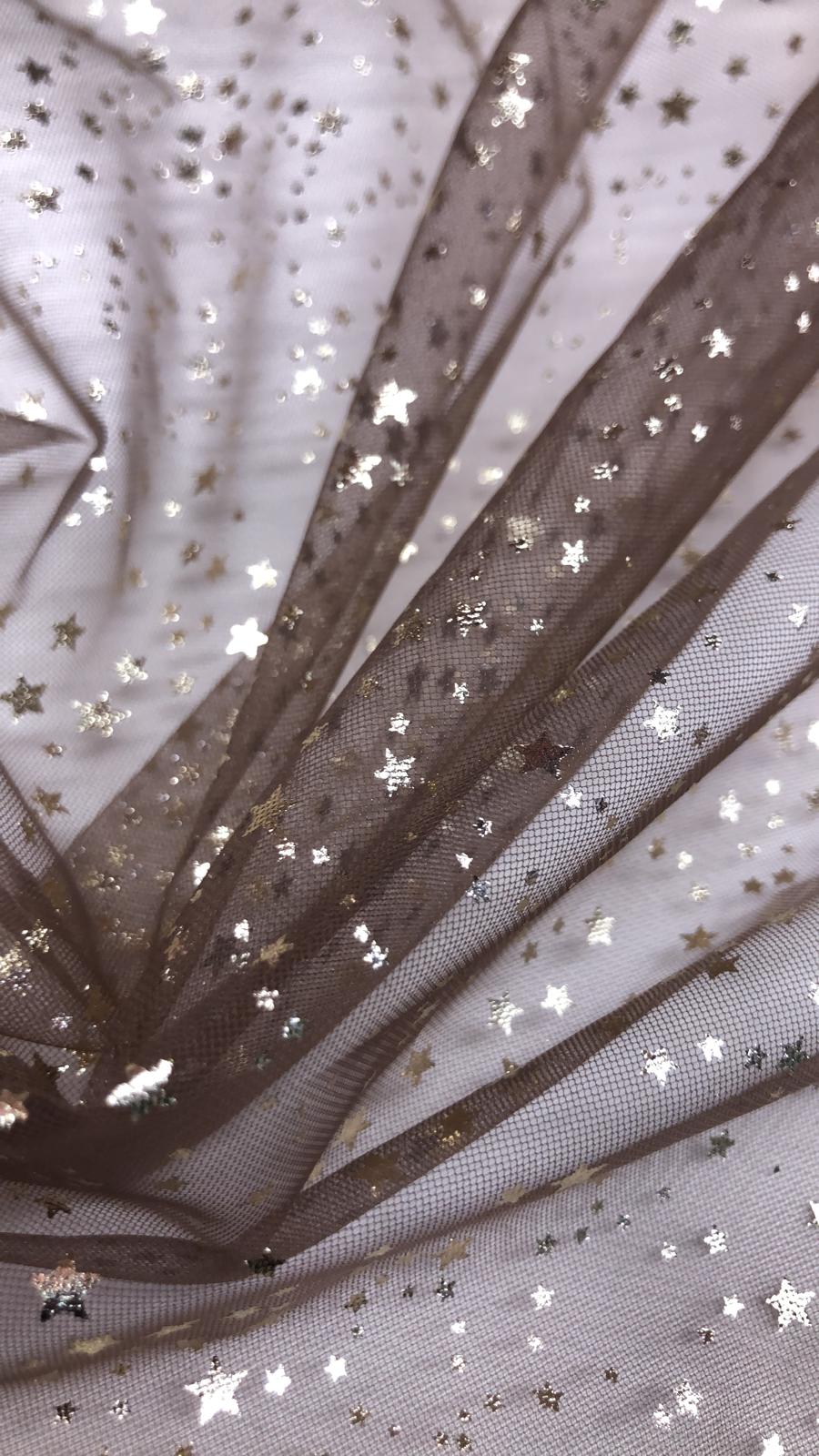 Açık kahve renk Hayal tül üzeri açık gold yıldız desen varak baskılıdır.